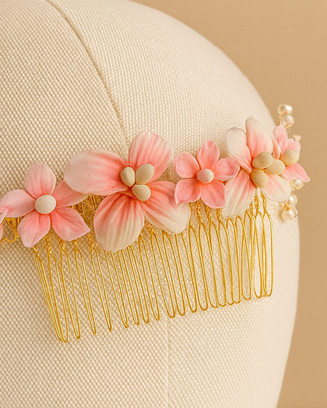 La peineta Corazón Contento es una pieza romántica y alegre que captura la esencia del amor y la felicidad del gran día. Perteneciente a la colección Bride Bloom, esta joya artesanal combina la delicadeza de las flores hechas a mano con el brillo sutil de las perlas y el dorado, creando un equilibrio perfecto entre dulzura y elegancia.