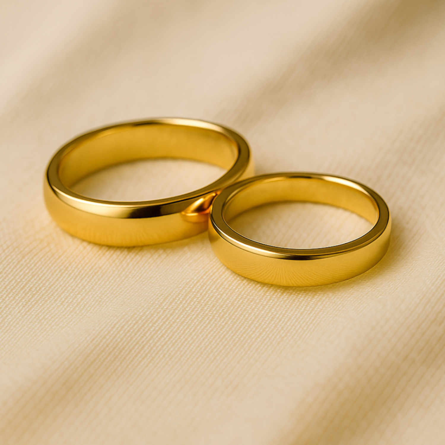 Un par de argollas clásicas para acompañarte en ese gran día. Hechas en oro amarillo de 18k, la argolla de hombre es de 5mm media caña y la argolla de la mujer de 3mm.