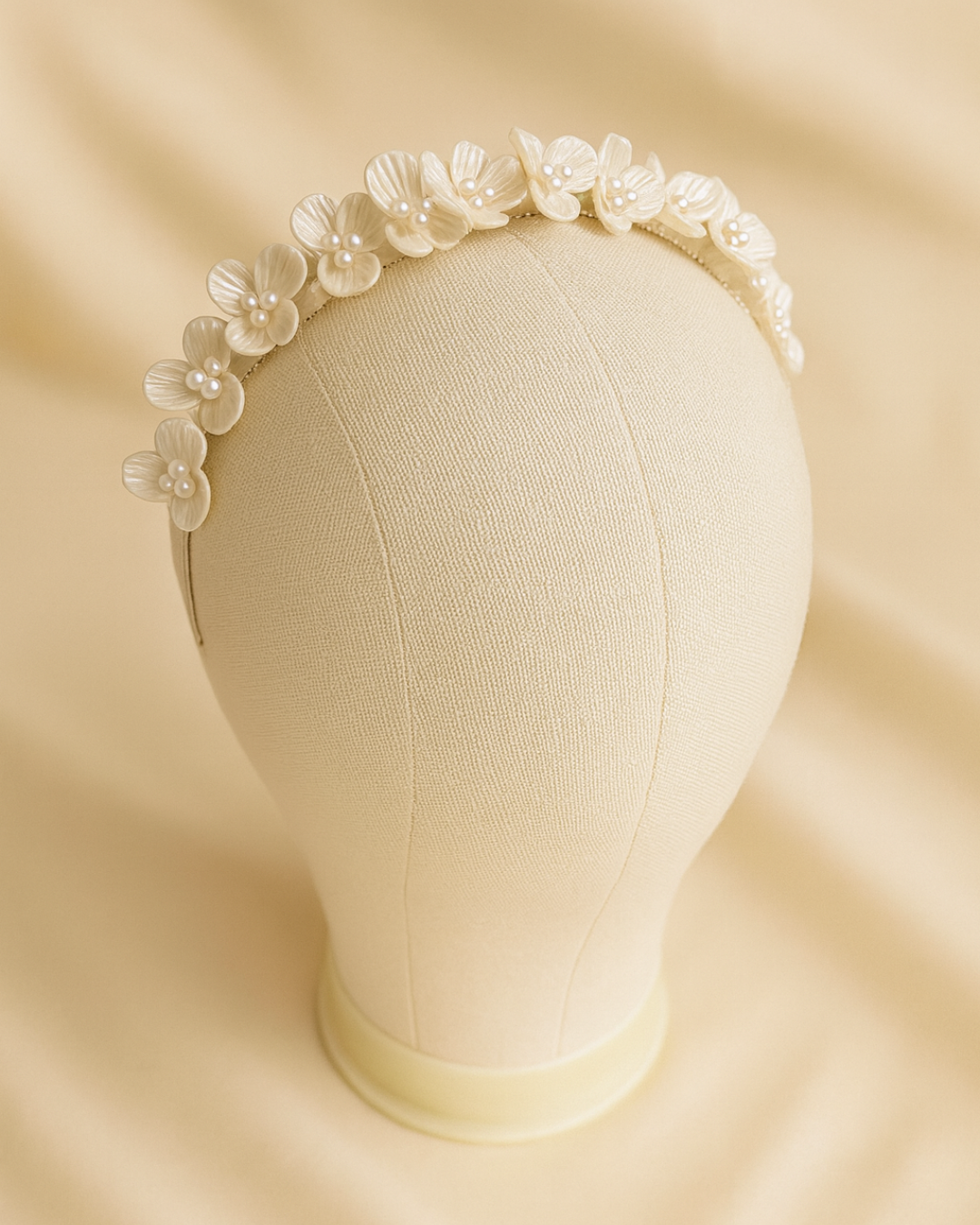 Una tiara tipo diadema clásica en blanco marfil con flores y perlas que simboliza un amor sin fin. Ligera, delicada y absolutamente atemporal.