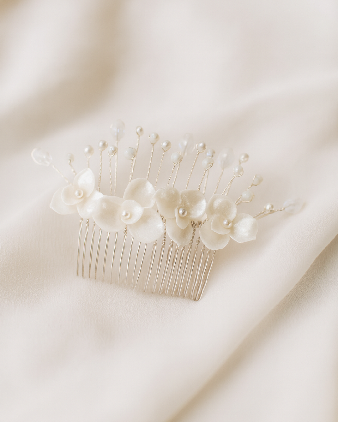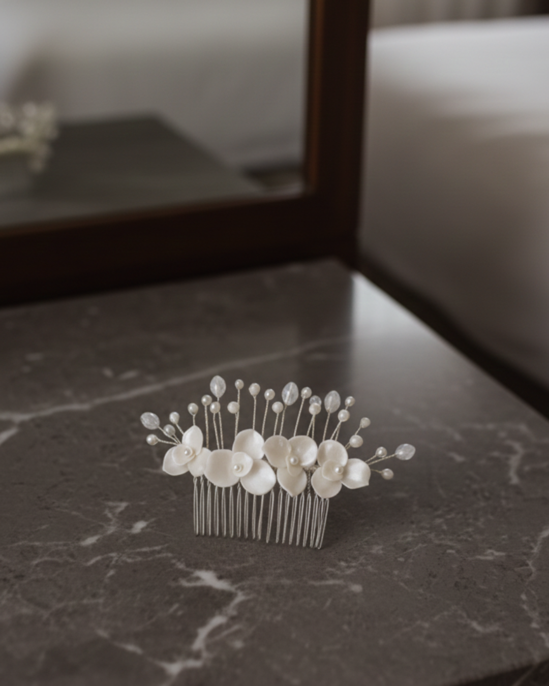 Haz que tu look nupcial brille con esta peineta única, diseñada especialmente para novias que buscan un detalle romántico y sofisticado. Está elaborada a mano con flores de porcelana fría de acabado nacarado, perlas delicadas y cristales facetados que capturan la luz de forma sutil y elegante.