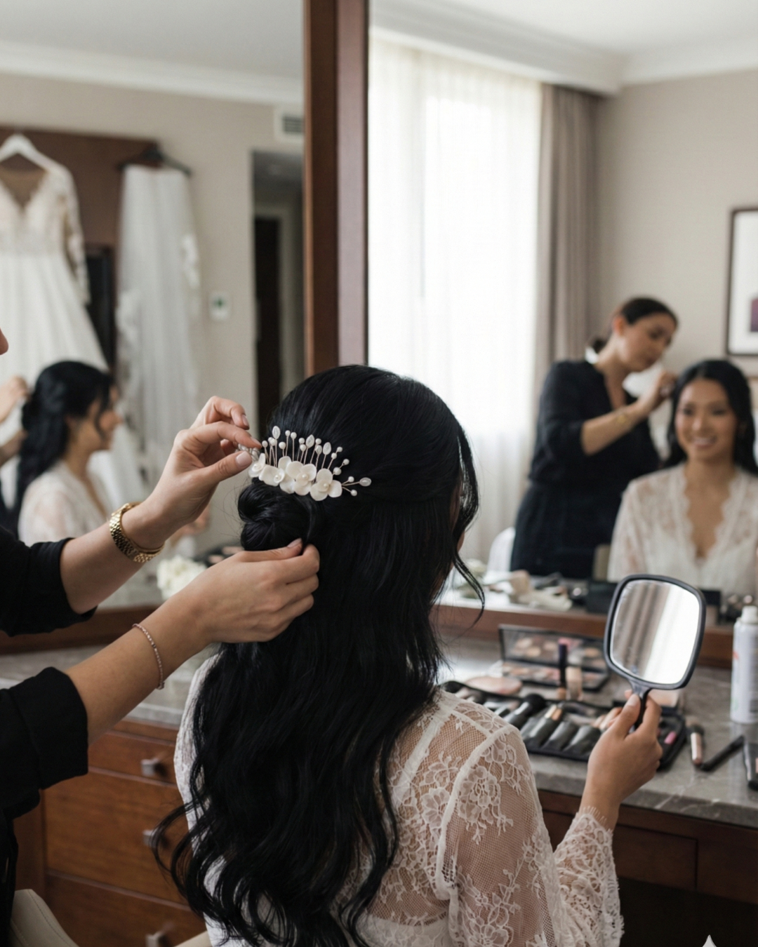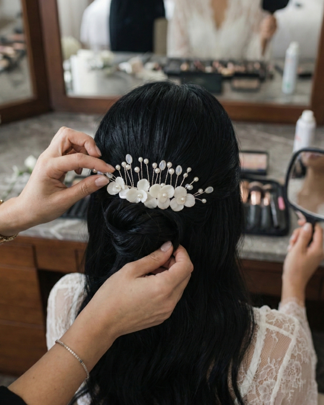Sus ramas moldeables permiten adaptarla fácilmente a distintos peinados: recogidos bajos, semi recogidos o trenzas. Ideal para bodas civiles, ceremonias religiosas o sesiones de fotos de novia.