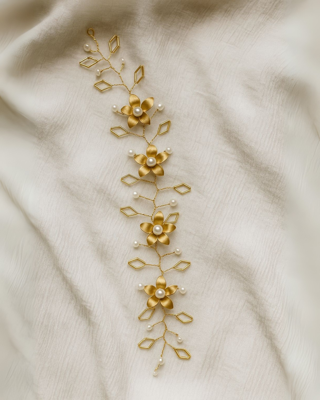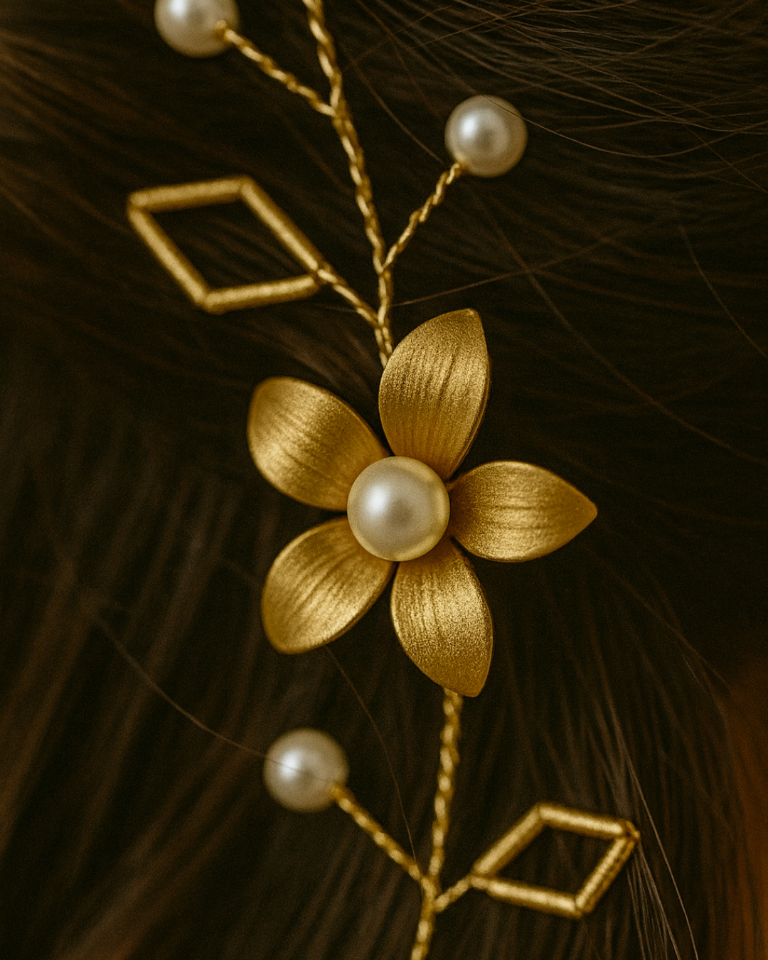 Solé es una tiara de novia que captura la esencia de la luz dorada del sol y la transforma en un tocado etéreo y elegante. Cada detalle está cuidadosamente elaborado a mano: flores metálicas en tono dorado mate, perlas blancas de distintos tamaños y delicadas hojas geométricas entrelazadas con alambre fino. El resultado es un diseño ligero, moderno y lleno de encanto.